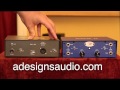 The A Designs KGB-1tf is the single channel version with a three-band fixed frequency equalizer and the addition of an extra duplicate parallel transformer output (balanced) via a TRS ¼ inch phone jack. The tone controls are a modified Baxandall circuit with high/low shelving corner frequencies at 5 kHz and 180 Hz. The Midrange frequency is handled by a peaking EQ section with a broad Q centered at 1.8 kHz. Each section is capable of up to 12 dB of cut/boost.