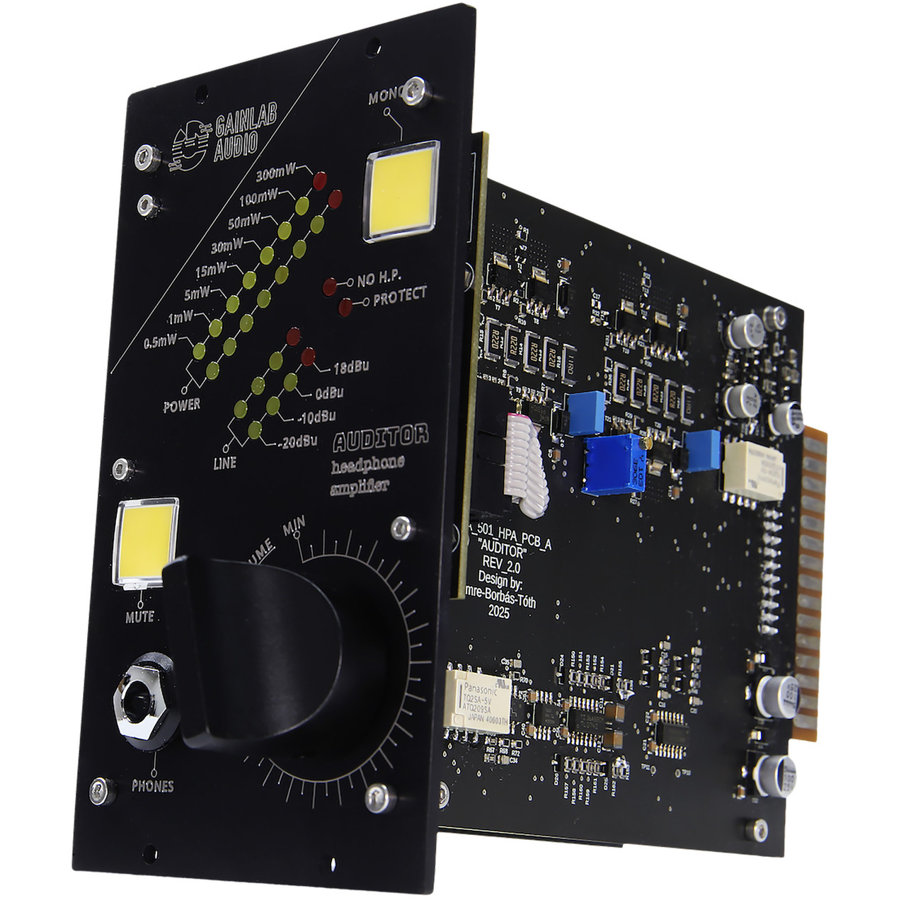 The Gainlab Audio Auditor is a professional 500-series headphone amplifier designed to fit into a standard 500-series chassis, engineered for both studio and field applications. In the professional audio world, the 500-series format is often chosen by those who want their proven systems in a compact and easily portable form. Our experience shows that one of the most essential companions in such setups is a reliable headphone amplifier and the Auditor was designed with exactly this role in mind. The Auditor is a high-power, crystal-clear sounding device that provides clear and unambiguous feedback about its operating conditions and characteristics, helping to protect both the user’s hearing and the connected headphones. Its main strengths are ultra-low distortion and a linear frequency response, combined with exceptionally large headroom. Thanks to its Class A design, it can drive headphones across a wide impedance range, delivering sufficient power. The connected headphones are protected against DC offset, overcurrent, and power-on transients. With its power and line-level indicators, operation remains predictable and fully reproducible. The unit also offers mono monitoring and an easily accessible mute function. Thanks to its 500-series format, the Auditor fits into any standard 500-series chassis. It is designed to pass the incoming line-level signal through the line outputs unchanged, allowing the signal to be daisy-chained for further monitoring or recording purposes.