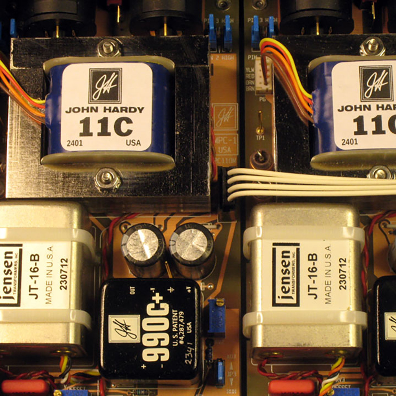The M-2 is sonically identical to the John Hardy M-1, but with a 16 position stepped gain providing accurate and repeatable gain settings from 15dB to 60dB in 3dB steps. The M-2 features a Jensen JT-16-B input transformer, John Hardy's very own 11C output transformer and a 990C+ discrete op-amp. This with the elimination of all capacitors from the signal path makes the John Hardy M-2 on serious preamp!