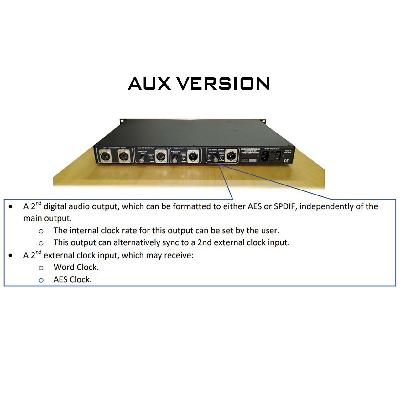 The AUX Version offers a second digital audio output with independent user control over audio formats and clocking to either internal or external clock sources. For example you can print a 96 kHz AES archive from the internal clock while simultaneously feeding a 44.1 kHz S/PDIF chain locked to an external clock for mix/release workflows. It’s like having two purpose-built converters in one box.
