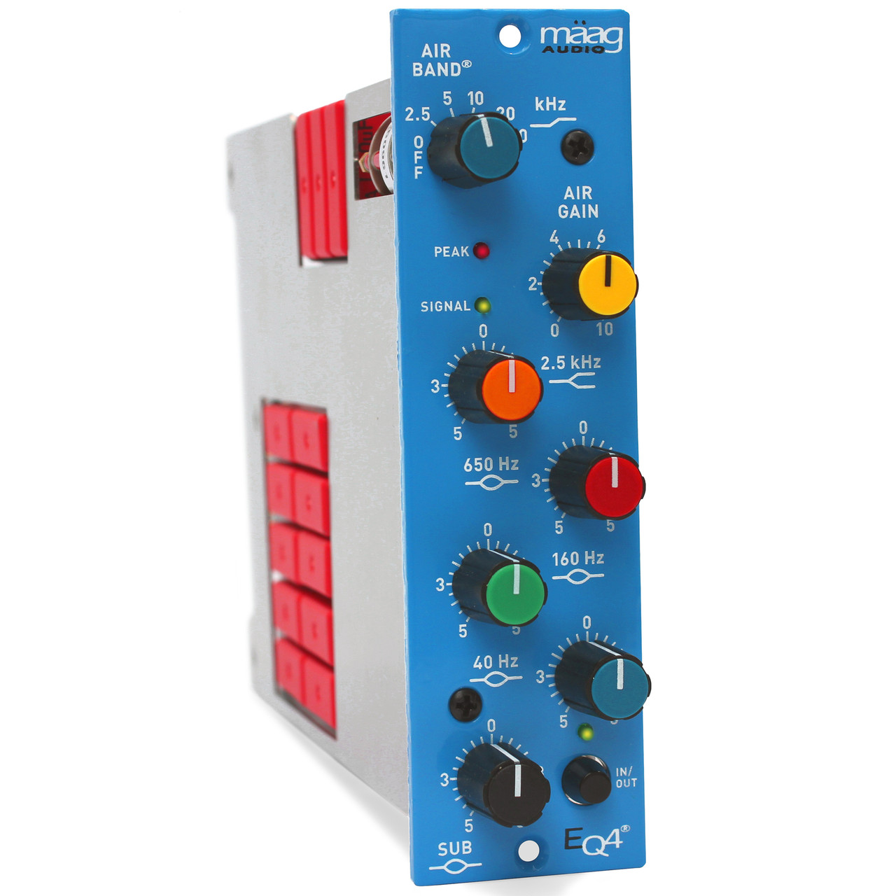 Like the 1U standalone EQ4M, the EQ4-500 includes six EQ band sections: four fixed-frequency bell-shaped peaking bands, a 2.5 kHz shelving band, and the renowned Air Band, with selectable frequencies at Off, 2.5, 5, 10, 15, 20, and 40 kHz. The five main frequency bands (Sub at 10 Hz, 40 Hz, 160 Hz, 650 Hz, and 2.5 kHz) offer up to ±15 dB of boost and as much as -4.5 dB of cut, with center detents at 0 dB for quick recall. The Air Gain control provides up to +20 dB of boost in the high-frequency shelf. Additional features include a green signal-present LED that activates at -20 dBu and a red peak LED that illuminates at +23 dBu. An In/Out bypass switch allows easy engagement or disengagement of the entire EQ section.