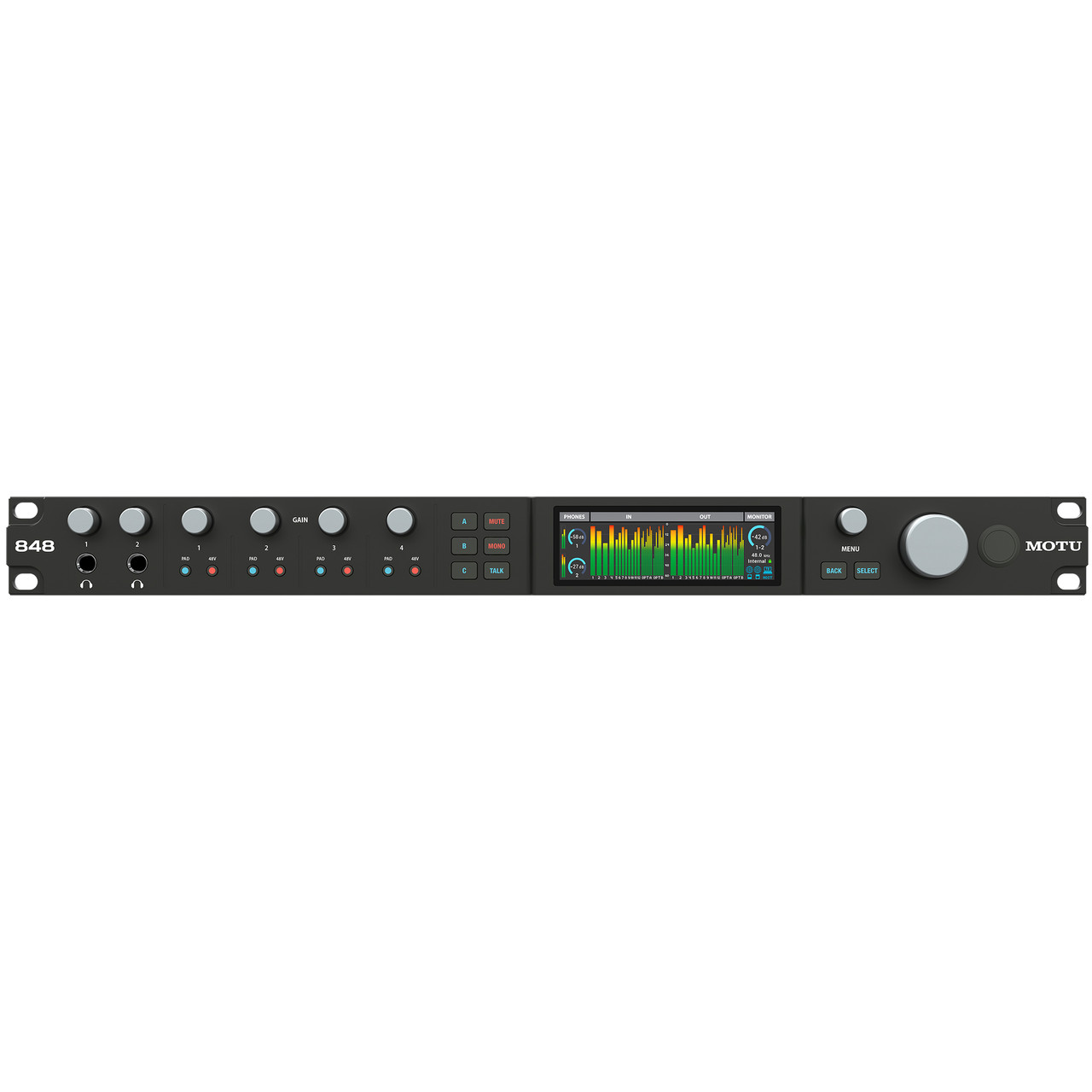 The MOTU 848 Audio Interface is a 1U rack-mounted audio interface for macOS, Windows and iOS. The 28x32 848 connects to a Mac, PC or iPad with 40 Gbps Thunderbolt 4 or USB4 with low-latency, high-performance drivers to deliver 60 total channels of I/O, 64-channel mixing with effects, and 128 channels of AVB network input and output.