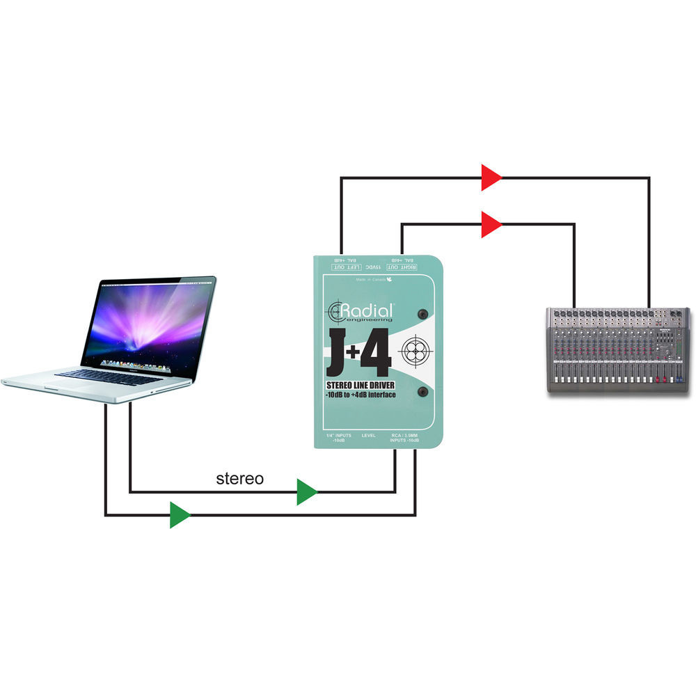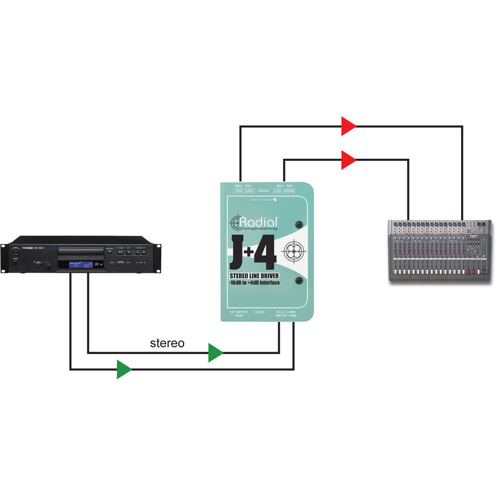 - Using the J+4 to boost a stereo signal - Increasing the output from a CD player to a +4dB balanced signal is easy. Just plug into the RCA inputs, adjust the volume level and the Radial J+4 does all the work. Transformer isolation eliminates ground loops for quiet performance every time.