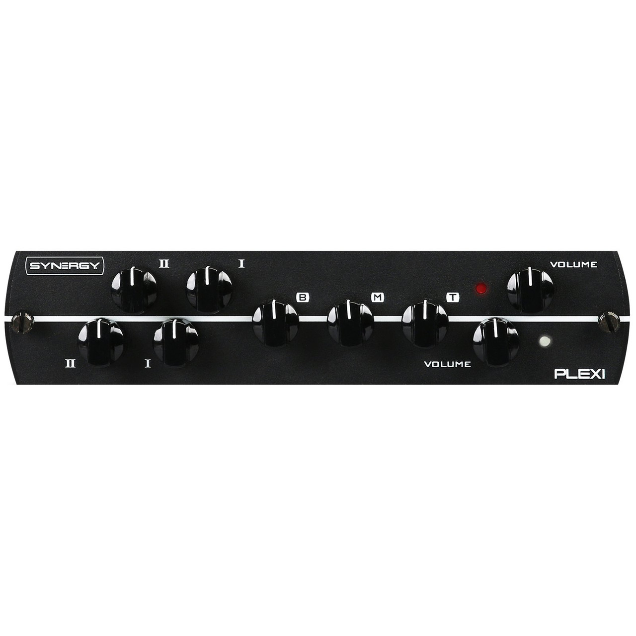 The Synergy Plexi Preamp Module is designed to be used with Synergy's modular hardware systems. It features two channels with distinct gain controls ("Input I" and "Input II"), allowing players to simulate the tone-shaping capabilities of a "jumped" input on a vintage Plexi amp. The module also includes a shared EQ section, a "sag" control to mimic the power amp compression of a tube amp, and a three-position switch to adjust the bass response for different classic amp configurations.